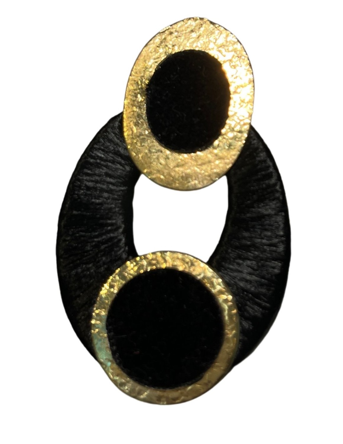 Una joya única de metal laminado liso y matizado, sin níquel, adornada con detalles de terciopelo.